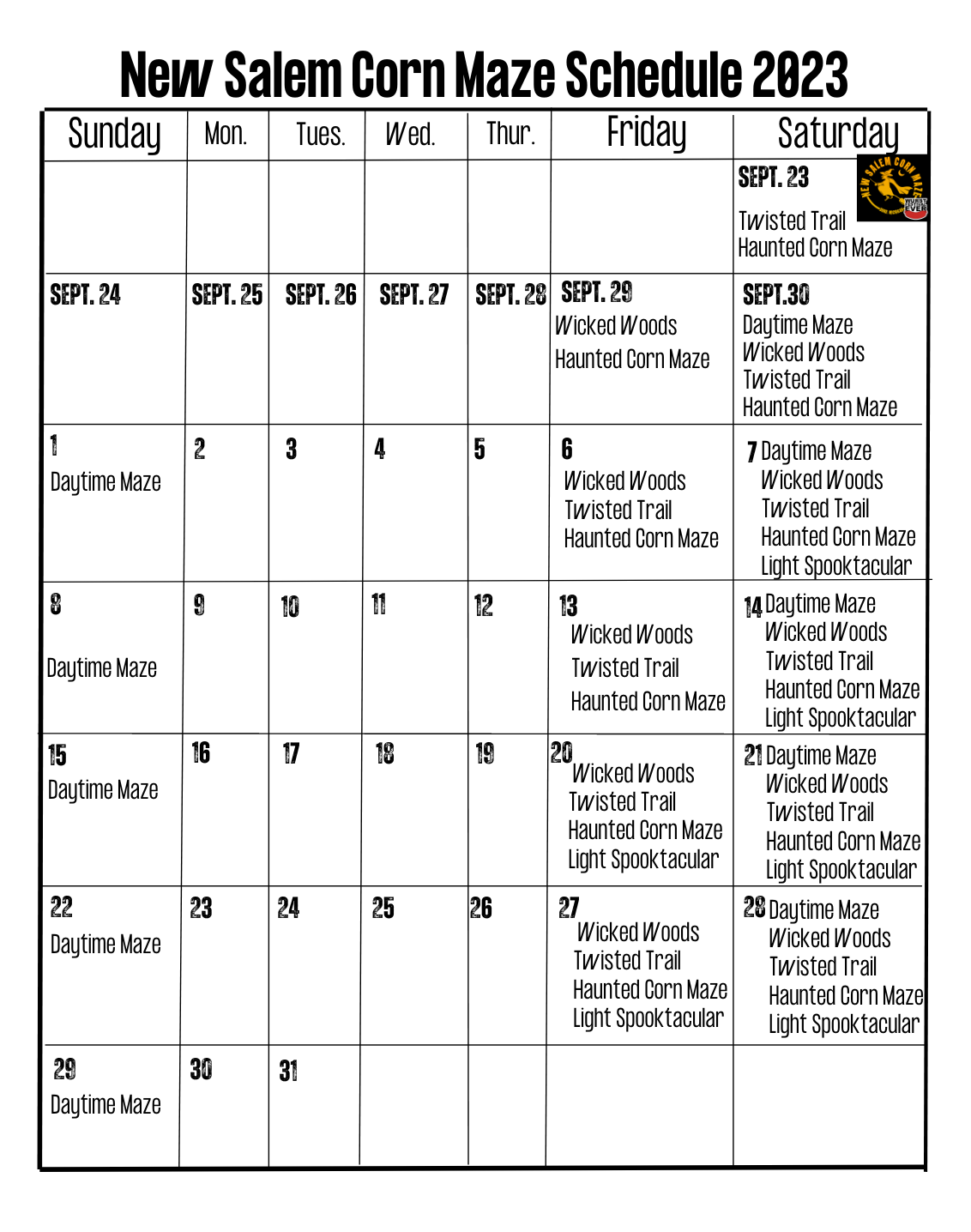 New Salem Corn Maze (NSCM) reserves the right to refuse admission to anyone. You will experience intense audio, lighting, extreme low visibility, strobe lights, fog, damp and/or wet conditions, moving floors, special effects, sudden actions and an overall physically demanding environment. You should NOT ENTER the NSCM if you suffer from asthma, heart conditions, prone to seizures, physical ailments, respiratory or any type of medical condition, are pregnant or suffer any form of mental disease including claustrophobia.